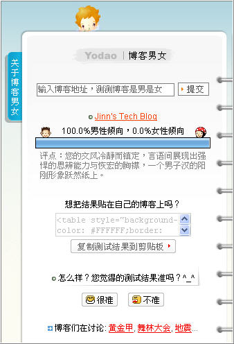 Yodao有道是對岸興起的搜尋引擎,主要著眼在中文網頁及Blog的搜尋,博客男女則是該網站提供的一個小測試,可以藉由你的文章來判別你是男是女,亦可由此進入測試網頁。
