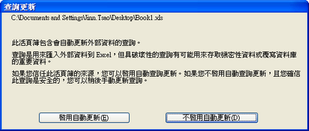 - 承上,選擇自動更新者,打開檔案時就會有提示視窗詢問是否自動更新,好處是可以開檔就可以提醒更新資料,壞處是更新資料總是要一點時間,尤其是資料量大的時候,我個人的習慣是用手動更新的。