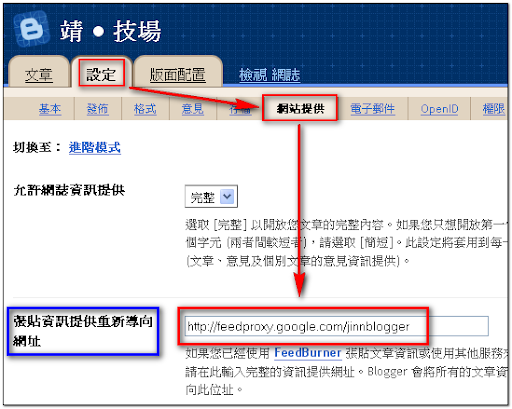 除此之外,還有一個小技巧在這邊與大家分享,因為訂閱者的RSS Reader是千百種,習慣也不同,對方可以使用你的FeedBurner訂閱,也可能直接用預設的Feed,當讀者是訂閱預設的Feed時,那FeedBurner的摘要輸出是否無效了?其實不然,你可以在Blogger後台的「設定」→「網站提供」頁面,尋找「張貼資訊提供重新導向網址」的項目,然後輸入FeedBurner的Feed位址,這樣Blogger就會統一把預設的Feed導向到FeedBurner,那不管讀者是訂閱哪一種Feed,最後所讀到的內容、設定都是以FeedBurner為主,自然地也可以套用摘要輸出設定。