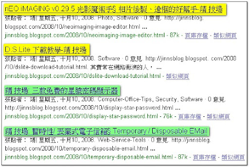 接下來,再做一個實驗,在Google中輸入「site:http://jinnsblog.blogspot.com/」來查詢有關我新網站的資訊。