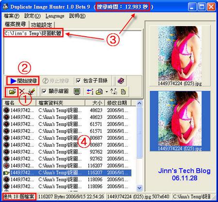 - 加入比對的資料夾,可增加多個資料夾,在此範例中的「Jinn’s Temp\捉圖軟體」資料夾,內含許多子資料夾,共含8787張圖片,之後介紹的軟體,也是以此為基準。