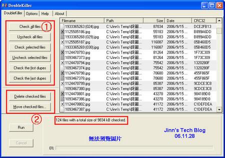 執行後,會自動跳到DoubleKiller的頁面,這裡並沒有統計搜尋時間,但花費的時間事實上是比第一款久,由下圖的報告可以輕易的看出共有124個檔案是重複的,比起上款的18個是否相差很多?可惜這款軟體沒有即時顯示縮圖,不過在後續的刪除、移動檔案方面,比起第一款好多了。