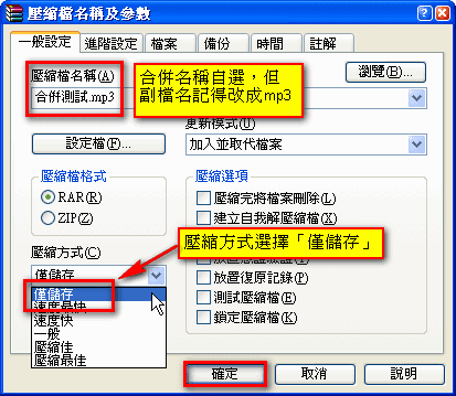 經過上個步驟後,應該會跳出以下這個畫面,接下來請修改壓縮檔名稱,重點在於要把副檔名改成「mp3」,並把壓縮方式設成「僅儲存」,最後按確定後就搞定了。