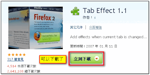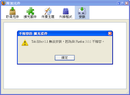 以「Tab Effect」這個extension為例,若使用FF3進入該安裝頁面時,看到的情況應該是無法安裝的。