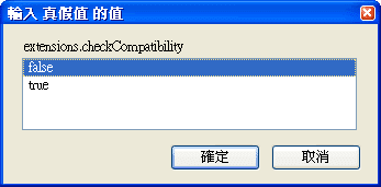 【Step5】輸入字串名稱「extensions.checkCompatibility」,並設其值為「false」