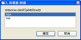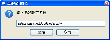 【Step6】承上,同樣的方法再建一個新的布林值(真假值),輸入字串名稱「extensions.checkUpdateSecurity」,並設其值為「false」