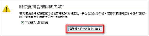 【Step1】 請在FF3的網址列中輸入「about:config」,並按Enter,選擇「我發誓,我一定會小心的」