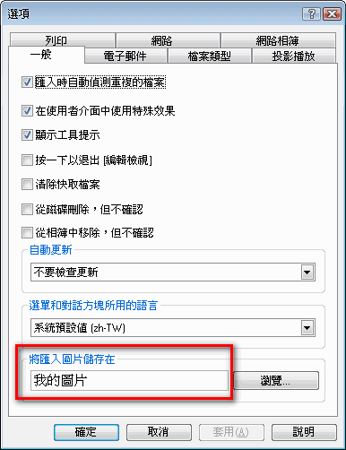 另外,要變更預設的儲存資料夾的話,請到「工具」→「選項」→「一般」頁面來變更