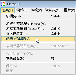 如果你只是要下載自己的相簿或有Picasa的帳號碼密,那可以直接由電腦的「Google Picasa」中匯入相簿就行了,請選擇工具列的「檔案」→「從網路相簿匯入」
