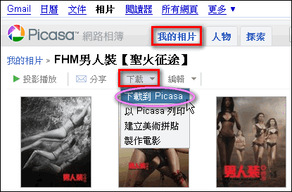直接進到要下載的Picasa網路相簿中,然後找到「下載」的選項,並選擇「下載到Picasa」,下圖中如果你是要下載別人的相簿,就不需要點選「我的相簿」,重點在「下載」這個選項。
