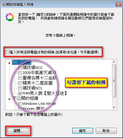 輸入帳號密碼後,勾選要下載的相簿,預設是全部勾選的,把勾勾取消才可以只選想要下載的相簿