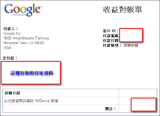 進入Adsense後台後,請到「我的帳戶」→「付款記錄」中,找到Google寄出款項的資料,如下圖,此時請點選「詳細資料」。