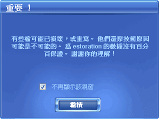 在按了「恢復」之後,這個軟體會貼心的告之並不是所有檔案都可以回復,讓使用者有點心理準備,下圖是提示畫面。