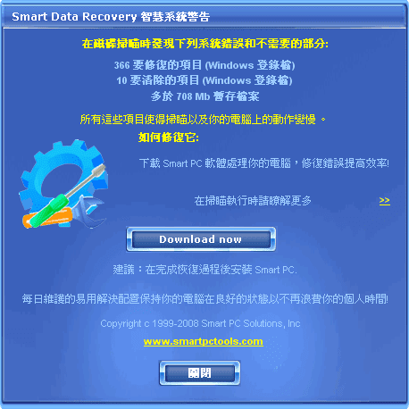 在掃描的過程中,也許會出現如下圖的智慧系統警告,這部分可以不用理會它,直接關閉就行了,當然如果你有興趣的話,也可以下載試用。