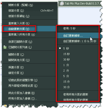 然後在分頁上,直接按右鍵,就可以看到「自動更新分頁」的選項囉!設定的方法都大同小異,試試吧。