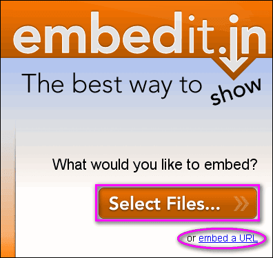 進入「embedit.in」,選擇「Select Files」由電腦上傳檔案,或者右下角的「embed a URL」由網路上的檔案來上傳(目前單檔限制20MB)。