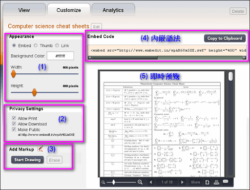 有時候想在網誌中展示文件的話怎麼辦呢?最直接的方法就是內嵌在本文中,怎麼做呢?可以利用「embedit.in」來達成我們的要求,它目前支援的格式有PDF、DOC、DOCX、XLS、XLSX、PPT、PPTX、TXT、常見的圖檔格式(GIF、JPEG、PNG、BMP等)或程式碼(THML、SQL、JS)等。