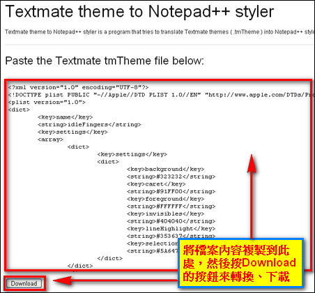 2. 接著到「Textmate theme to Notepad++ styler」,將在步驟一所copy的內容,貼到空白欄位中,然後按「Download」即可以開始轉換下載。註:有些主題的格式不符合標準的話,可能會轉換失敗。