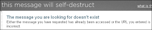 「This Message Will Self-Destruct」誠如該服務名字所說,這是個可以自我毀滅的訊息留言系統,使用者可以留下想要給別人的訊息,待訊息被讀取過之後,訊息就會自動刪除,達到某種程度的安全要求,算是一個簡單的小應用,和之前介紹過用完就丟的臨時性電子信箱,有異曲同功之妙。