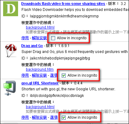 在此會列出所以已安裝的擴充套件,想要在無痕式瀏覽視窗中使用Extension的話,只要把「Allow in incognito」勾選起來就行了。