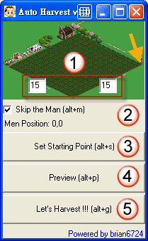 - 填入要收成的農田數,例如你的農田大小是15×15,那就各填入15於空白欄內,也可以分次收成,例如先收10X15、再收5X15,看圖應該很容易了解。