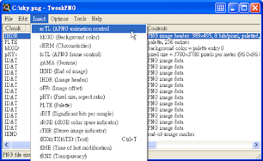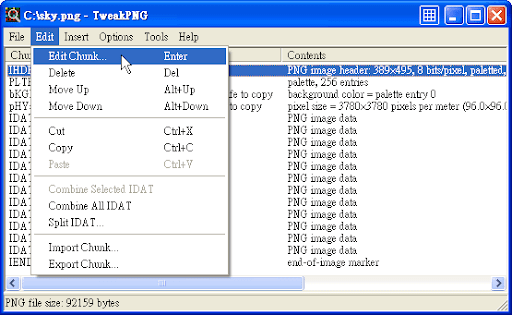 「TweakPNG」是一個低階工具,可以用來解析和編輯PNG格式的圖檔,雖然這個工具對一般使用者來說太難了,而且也用不到,但對軟體或程式設計師來說,到是一個蠻不錯的比對、編輯工具;因為透過這個工具,可以輕易看出每個欄位的值,亦可以進行修改、插入、匯出、匯入等編輯動作,然後即時看出修改後的圖檔結果,當然想要修改這些欄位需要對PNG格式的組成欄位有一定的了解才行。