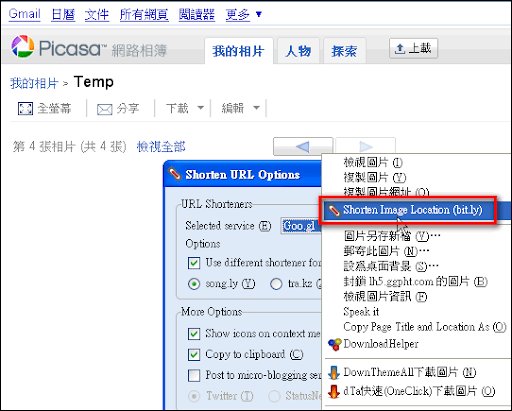 除了上述的方法外,Shorten URL也有整合到滑鼠右鍵中,只要在有網址的地方就可以使用;例如下圖,在圖片上按滑鼠右鍵,會出現Shorten URL的選項,你可以利用這個功能直接把原網址轉成短網址