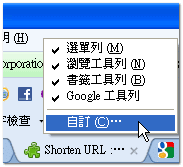 安裝完Shorten URL後,正常來說應該會在工具列上出現圖示,如果發現在安裝完成後並沒有什麼變化,這個時候可以自行加入:請先在功能表上按滑鼠右鍵,並選擇「自訂」