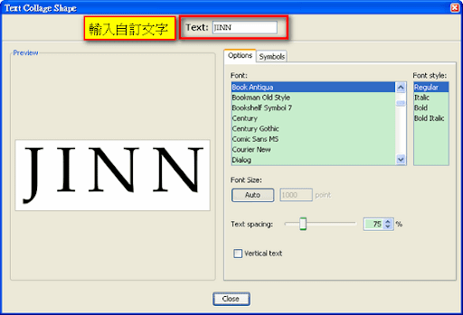 現在來提提外形設定的部分(即右邊的「Shape and Size」頁面),在Shape選項中可以選擇矩形的Rectangle、心形的Heart或圓形的Circle,較特別的是「Text」,它可以自行輸入你要的文字