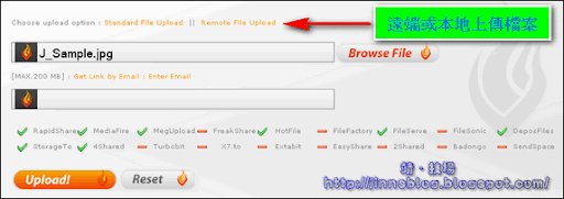 進入FU之後,你可以選擇要本地上傳(Standard File Upload)或遠端上傳(Remote File Upload),若是遠端上傳檔案的話,那麼將網址填入欄位中即可,本文以本地上傳為例:由下圖可以看到整個操作介面和一般的分流服務類似,可由「Browse File」來選擇上傳的檔案,並勾選想要上傳到哪些免空中,目前一次可同時上傳到8個空間中,單檔最大200MB,最後按「Upload!」上傳即可。如果在「Get Link by Email」的欄位中有填寫EMail的話,那麼FU會貼心的把下載網址寄到該信箱中,所以你可以直接填寫接收者的Mail,那麼就不用自己在發一次下載網址了。