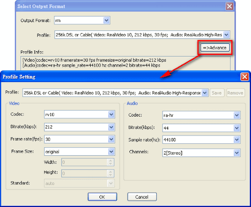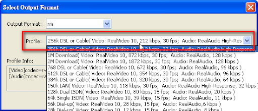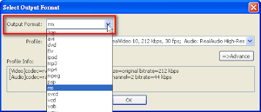 另外,如果你選擇的是重新編碼為其他格式的話,那麼就會出現下面二張圖的畫面:在此視窗中,你可以選擇要輸出的格式及規格(Profile)