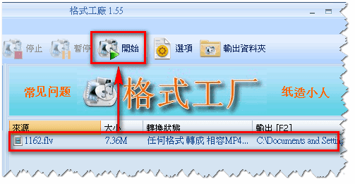 在上個步驟按確定後,會跳至主視窗,現在應該可以看到剛剛加入的檔案,請按「開始」來進行轉檔,個人試用的結果是轉檔的速度還算快、品質也屬中上,雖然「某些」格式互轉後,畫質/品質有一點下降,但這是無法避免,整體而言,效果都相當的不錯,不失為一個轉檔的好工具。