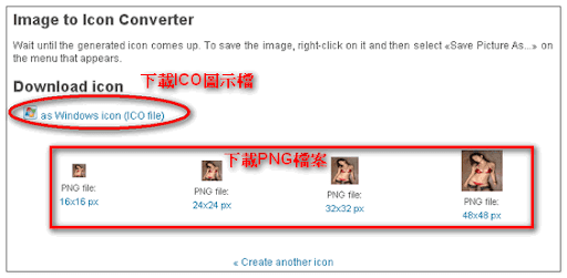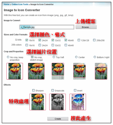 Softicons另外還提供二個線上工具,分別是「Favicon Generator」、「Image to Icon Converter」,二者的操作大同小異,比較不同的地方只是產生的圖檔大小,因為Favicon總不能用太大的圖吧,以下就以「Image to Icon Converter」為例來說明: